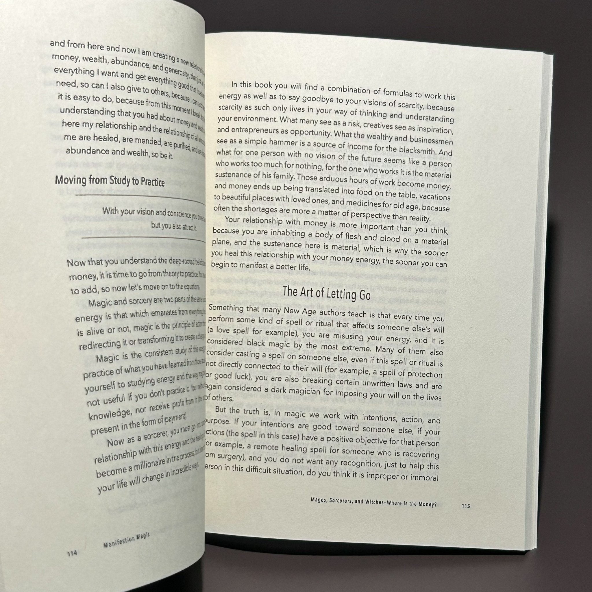 The book is divided into two sections: The first section guides the reader through some basic, if simultaneously sophisticated, magical theory including the power of attraction. Readers are encouraged to develop a magical mindset.