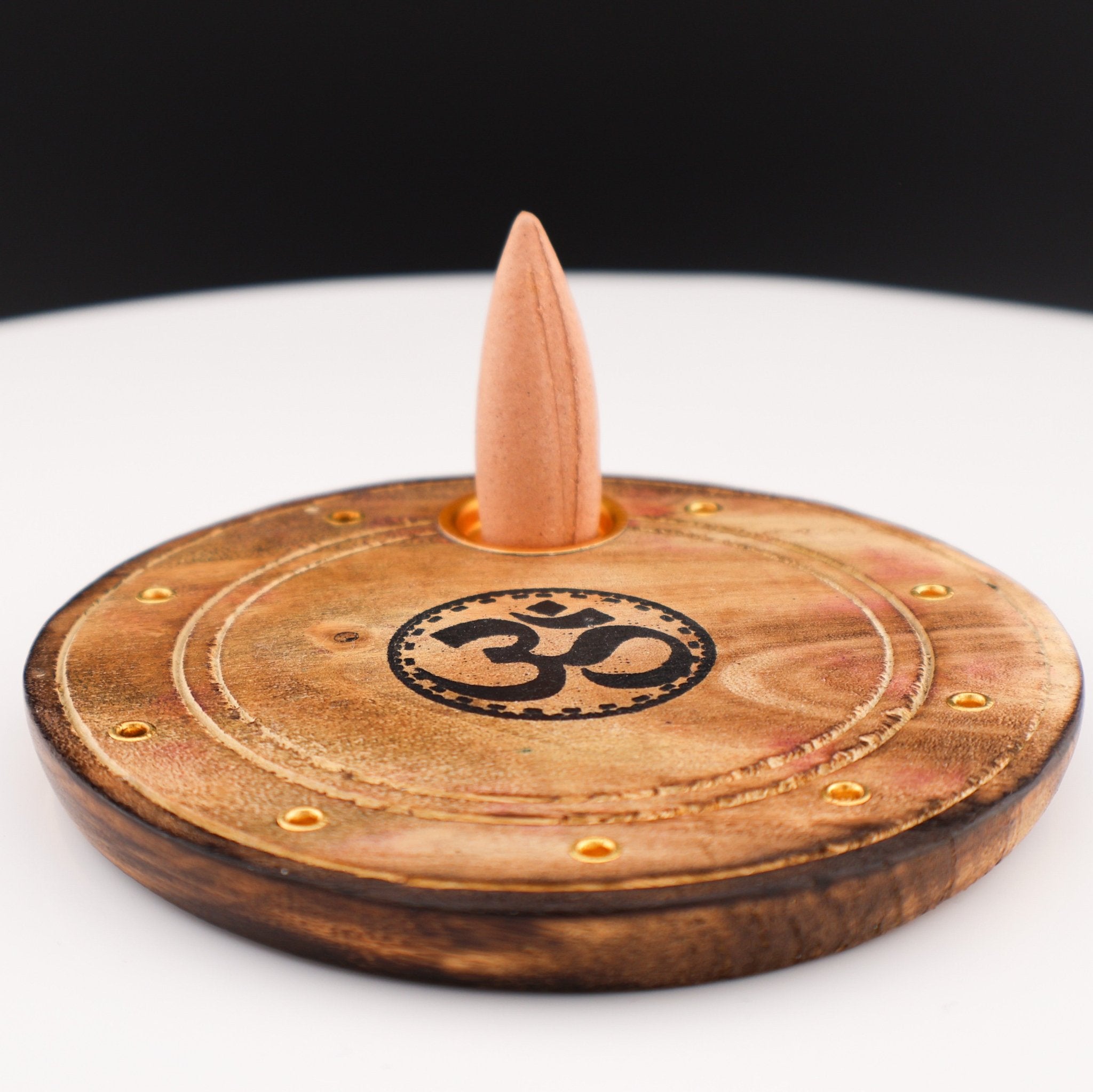 This 3.75" round wood burner, allows for use with incense cones and has the OM symbol in the center. This round tray makes for a sturdy burning surface, making this a great choice for any alters, intention sessions or just a cleansing of your space.