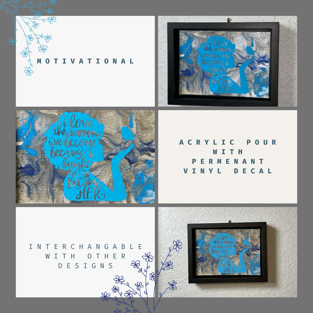 Celebrate the journey of growth and transformation! This one-of-a-kind piece features a permanent vinyl quote that reads "i love the women i've become because i fought to become HER" over a stunning grey and blue acrylic pour, perched in a beautiful 5x7 wooden frame. So, go ahead and proudly display your growth, confidence, and strength!