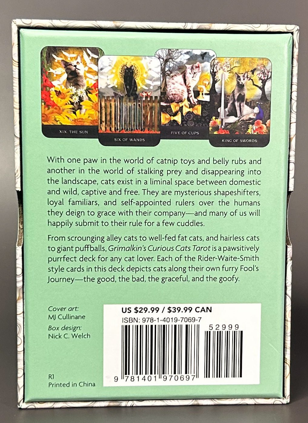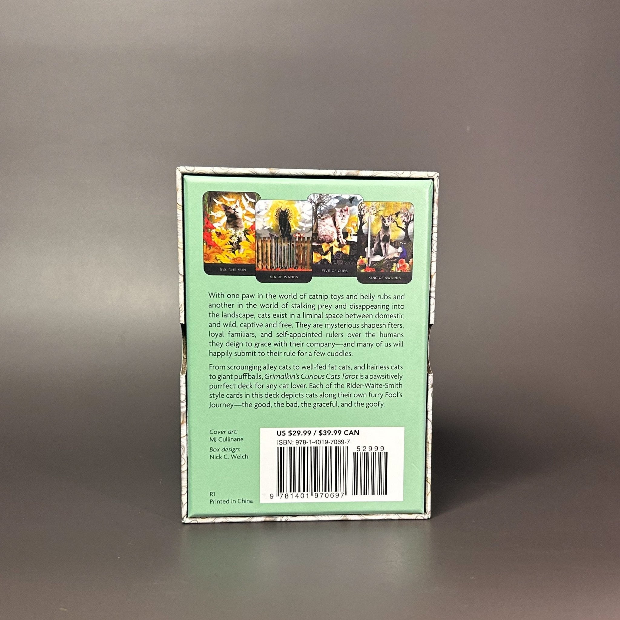 From scrounging alley cats to well-fed fat cats, and hairless cats to giant puffballs, Grimalkin's Curious Cats Tarot is pawsitively purrfect deck for any cat lover.  Each of the Rider-Waite-Smith style cards in this deck depicts cats along their own furry Fool's journey-the good, the bad, the graceful, and the goofy.