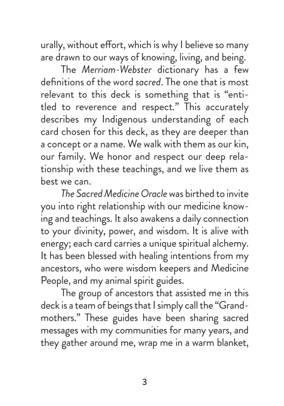 The Sacred Medicine Oracle was birthed to invite readers into a conscious and respectful relationship with medicine teachings, awakening a daily connection to your own inner divinity, power, and wisdom. From the powerful remembering of "Past Life Medicine" to the promise of miracles with "Jingle Dress," each of the 56 cards depicts ceremony, traditions, moon phases, animal guides, and plant allies, all of them alive with energy and blessed with healing intentions from the ancestors.