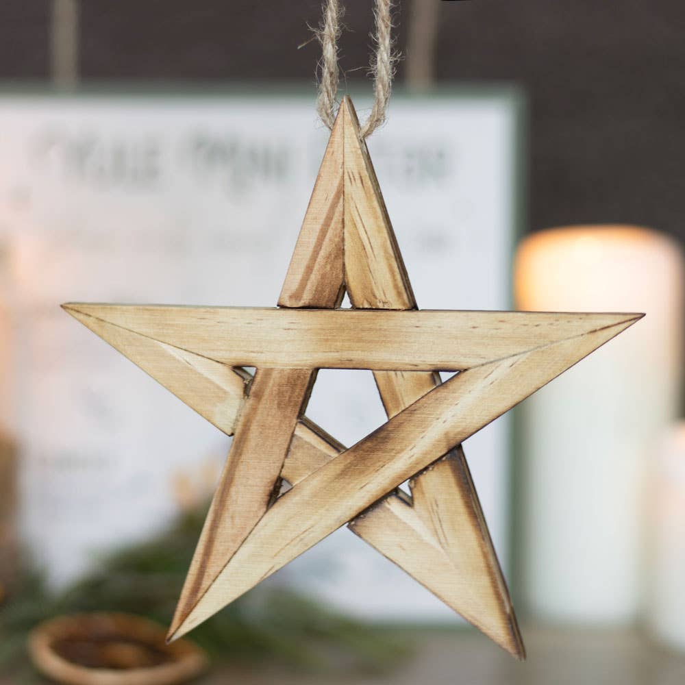A medium hanging wooden pentagram which can be used to decorate the home for Winter Solstice, the ancient pagan holiday known for traditions and rituals that celebrate nature, rebirth, transformation and the oncoming season.